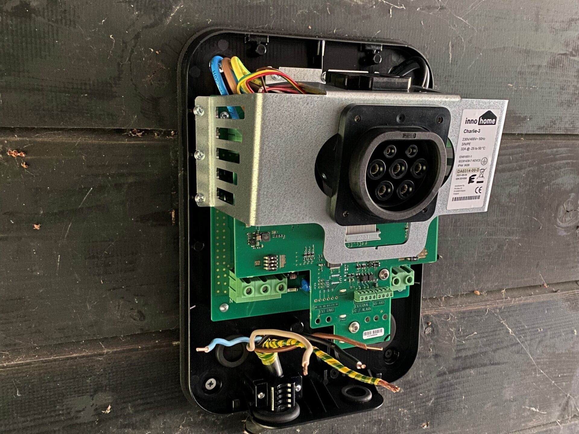Innohome Charlie on helppo asentaa. Määritetään dip‑kytkimistä vain kohteeseen mitoitettu maksimi sähköteho, porataan tuote seinään ja tehdään 3‑vaihejohtoasennus.